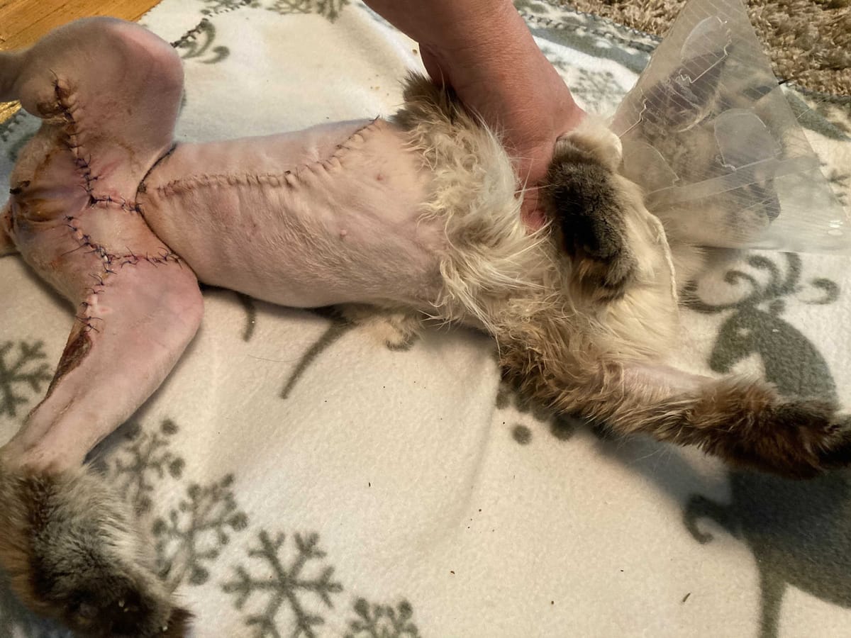 "Asiasta aiheutui palovammoja. Kissan vointi oli yön ja seuraavan päivän hyvä, mutta sitten sen haava aukesi hakasten vierestä koko matkalta. Tässä vaiheessa eläinlääkäri oli soittanut omistajalle ja kertonut asiasta. Kissalle tehtiin useita ihonsiirtoja Tammiston eläinsairaalassa."